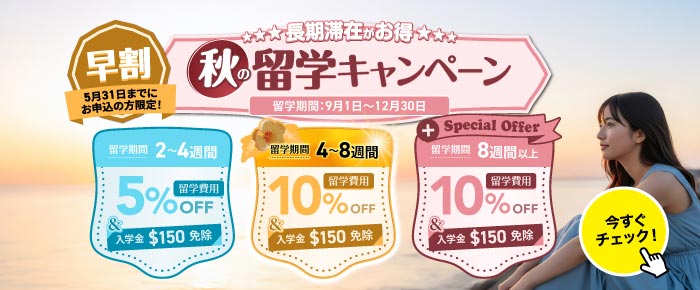 QQEnglishの大きな魅力は、そのスケジュール自由度の高さです。多くの学校が毎週月曜日を入学日としているのに対し、QQEnglishはなんと「1日から入学OK」。フライトの都合や、仕事、育児、学業の合間を縫って留学したいなど、様々なニーズに合わせて、平日であればいつでも留学を開始できます。これにより、例えばフライトが安い日に合わせて出発日を調整したり、急に時間ができたタイミングで留学を決意したりすることも可能です。もちろん、初日からしっかりと授業を受けられるので、時間を無駄にすることなく、すぐに英語学習をスタートできます。